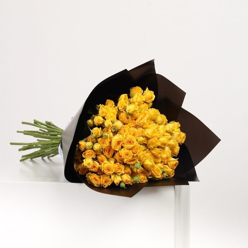 20 زهرة بيبي روز بلون أصفر نابض بالحياة، تعبّر عن الفرح، الامتنان، والتفاؤل. تغليفها الأسود الأنيق يبرز إشراقة الورود ويضيف لمسة فاخرة.