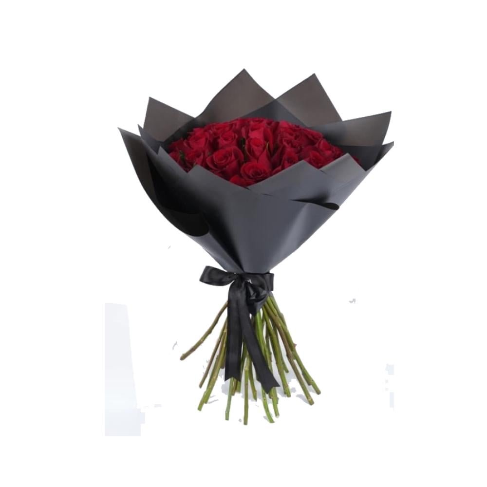 باقة ورد جوري أحمر داكن بتغليف أسود ملكي أنيق، صُممت لتعكس الفخامة والغموض في آنٍ واحد. تتكون هذه الباقة من ورود جوري بلون أحمر عميق، تم اختيارها بعناية فائقة وتنسيقها باحتراف داخل تغليف فاخر بلون أسود مطفأ، مع شريطة سوداء حريرية تزيدها هيبة وأناقة.